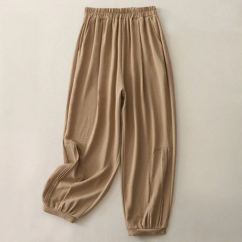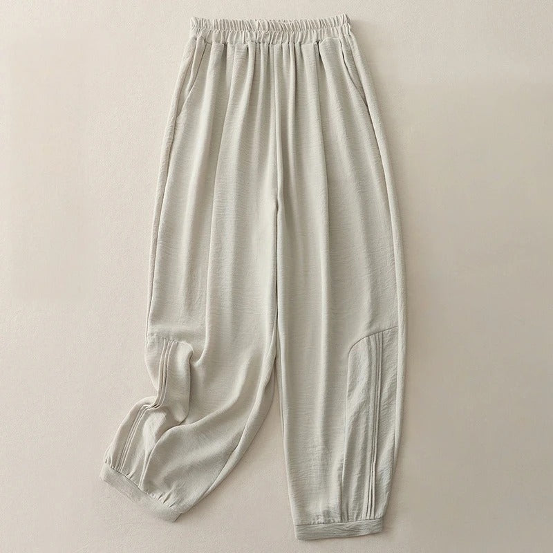 Woven from soft linen, these pants bring ease to everyday wear. A gentle drape flows from a gathered waist to tapered cuffs, finished with stitched side accents—crafted for quiet comfort and casual grace.