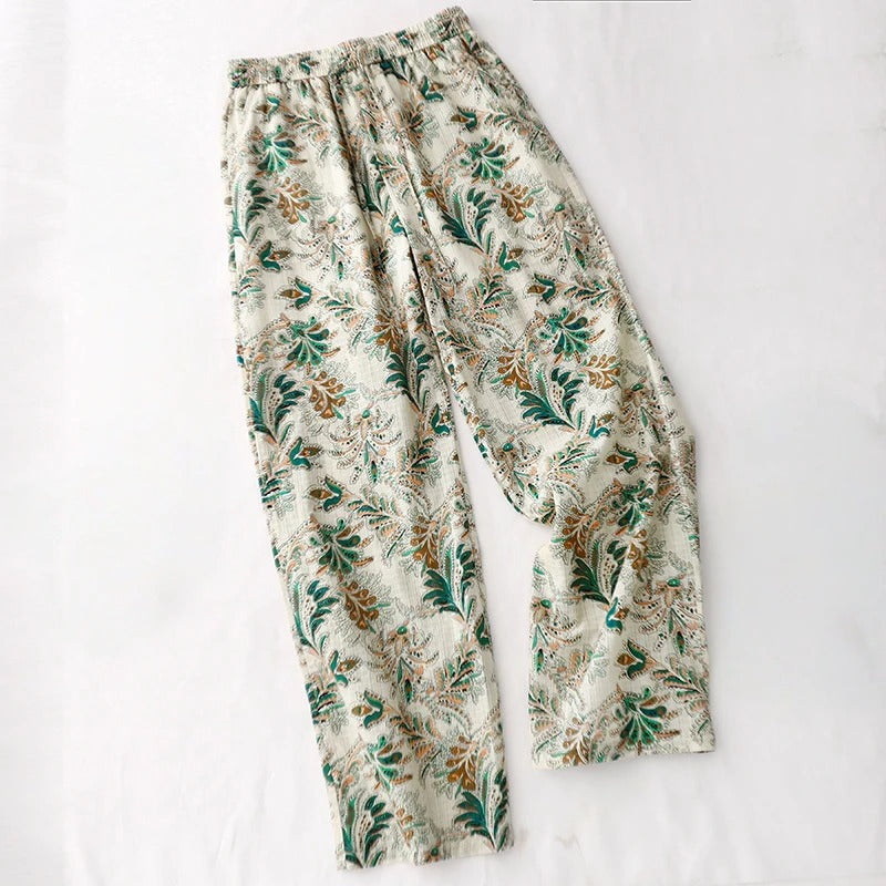 Spun from gossamer-light linen, these pants bloom with layered motifs that echo antique wallpapers and wandering gardens. The fluid silhouette moves like breeze through fabric, while the gathered waistline softens the form with nostalgic rhythm.