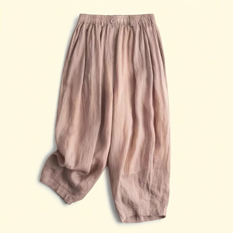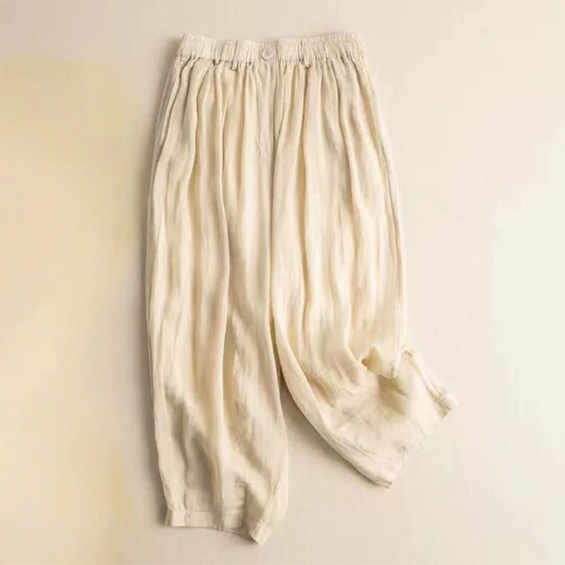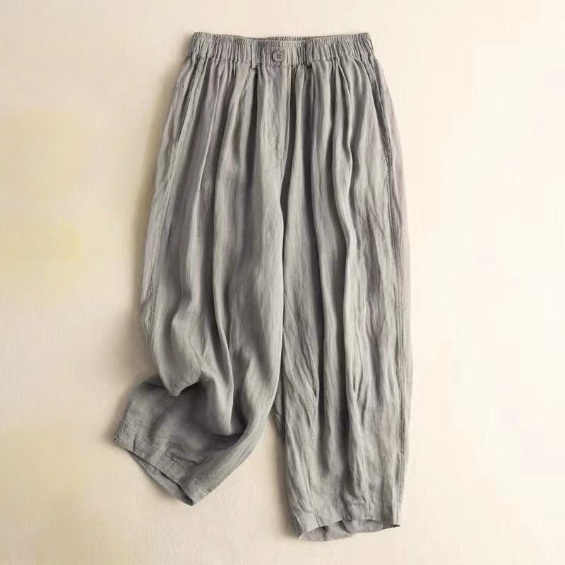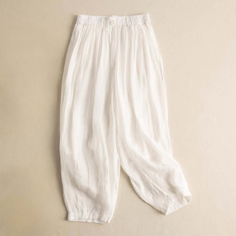 Woven from our signature Gossamer linen, these pants bloom with tonal threadwork—barely there, like breath on a mirror. Designed with a voluminous cut and soft taper, they move with quiet grace.
