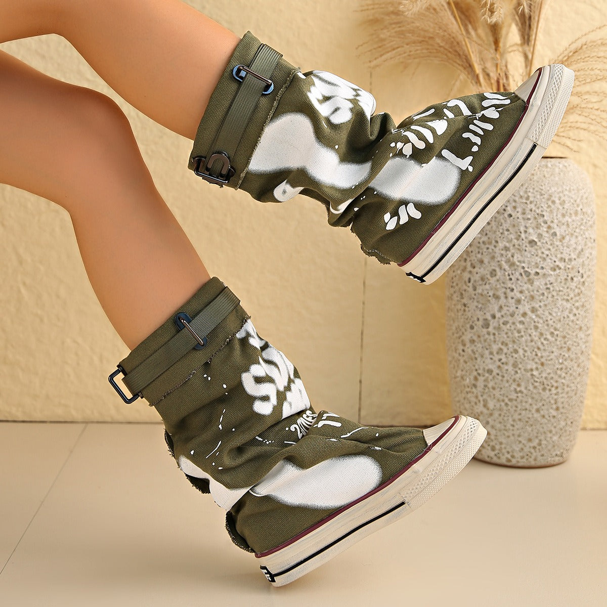 These boots move like a manifesto—raw, expressive, impossible to ignore. The silhouette feels deliberate yet defiant, merging comfort with visual impact. Every step carries attitude, texture, and presence, designed for women who dress instinctively rather than safely.